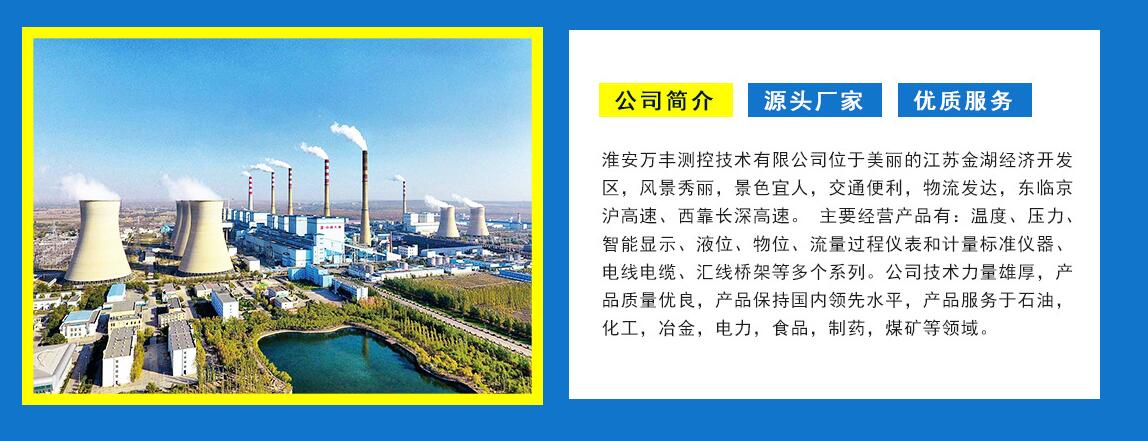 淮安萬豐測控技術(shù)有限公司位于美麗的江蘇金湖經(jīng)濟開發(fā)區(qū),風景秀麗,景色宜人,交通便利,物流發(fā)達,東臨京滬高速、西靠長深高速。 主要經(jīng)營產(chǎn)品有:溫度、壓力、智能顯示、液位、物位、流量過程儀表和計量標準儀器、電線電纜、匯線橋架等多個系列。公司技術(shù)力量雄厚,產(chǎn)品質(zhì)量優(yōu)良,產(chǎn)品服務(wù)于石油,化工,冶金,電力,食品,制藥,煤礦等領(lǐng)域。 公司秉承“以人為本,質(zhì)量至上”的經(jīng)營理念,“力求完美,務(wù)實開拓”的企業(yè)精神,“健全體系,銳意創(chuàng)新”的質(zhì)量方針,實現(xiàn)萬豐企業(yè)規(guī)?;⒓瘓F化、現(xiàn)代化的宏偉藍圖。 熱忱歡迎廣大客戶光臨指導惠顧,攜手共創(chuàng)輝煌。